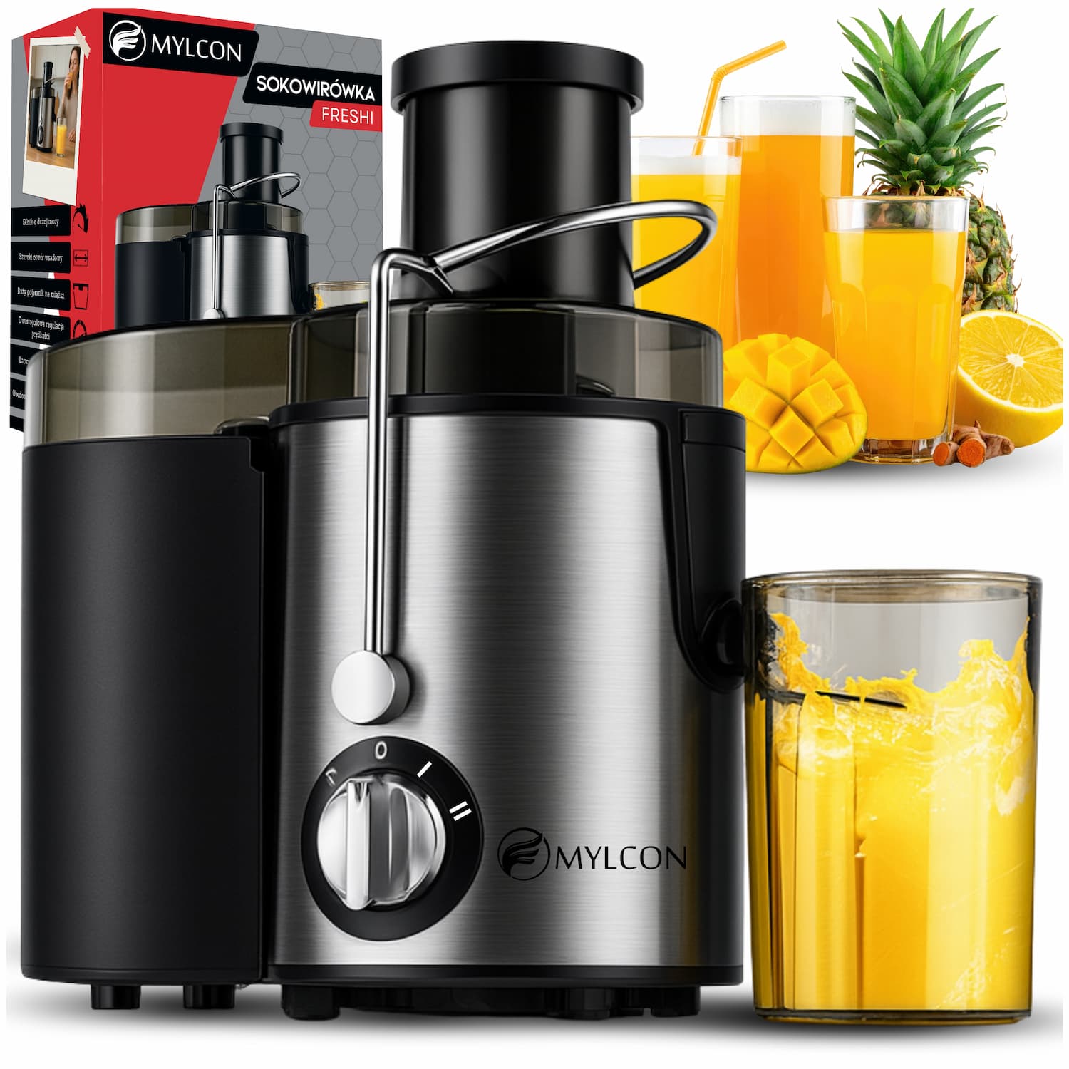 MYLCON Freshi łączy wysoką moc, funkcjonalną konstrukcję i systemy bezpieczeństwa, które pozwalają cieszyć się świeżym sokiem każdego dnia bez bałaganu i zbędnego wysiłku.